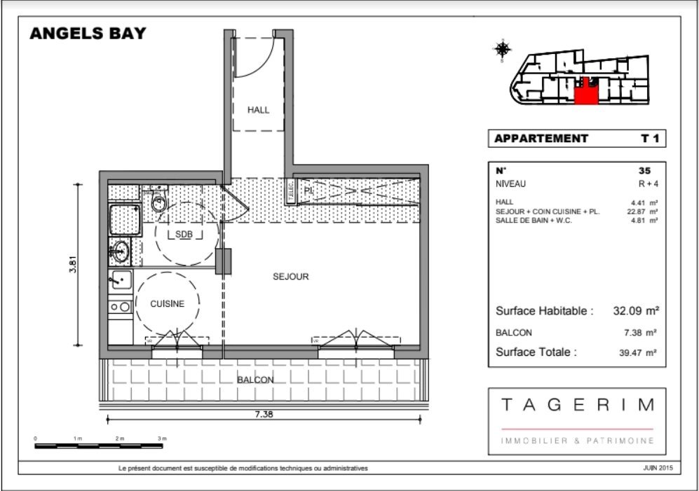Dans un immeuble de 2018, au 4eme étage avec ascenseur, beau studio de 32 m² composé d'une entrée, pièce principale avec cuisine américaine aménagée et semi équipée ( plaque 2 feux, frigo, hotte)et grand placard aménagé, salle de bains avec meuble vasque, terrasse de 8 m² plein sud.