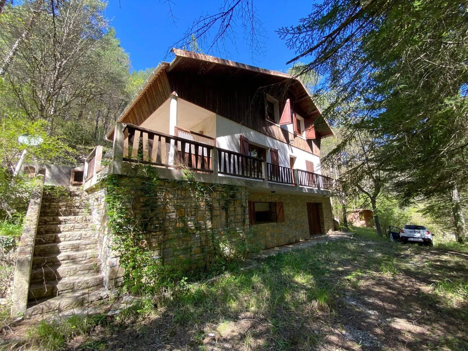 Ici, le temps semble suspendu. Le calme est absolu, seulement troublé par le chant des oiseaux. La nature entoure entièrement cette belle bâtisse de 5 pièces, réparties sur trois niveaux.