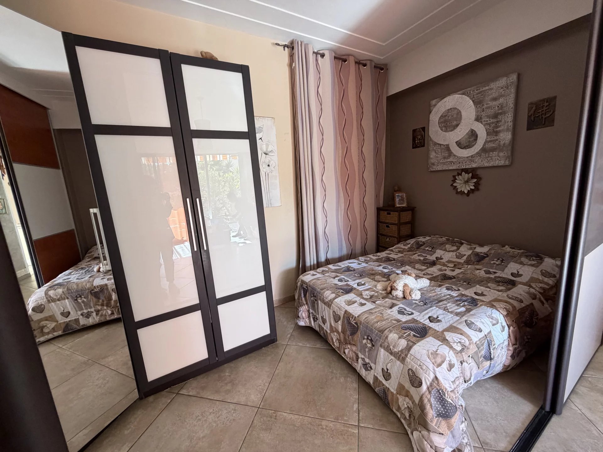 L’appartement climatisé offre une entrée avec placard, une cuisine ouverte aménagée et équipée avec passe-plat, ainsi qu’un spacieux séjour lumineux de 26 m². Un coin nuit indépendant avec dressing et rangements, fermé par deux portes coulissantes, permet de créer un véritable espace séparé et confortable.